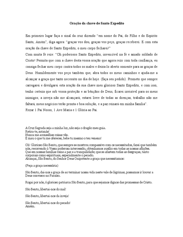 Mostraremos a melhor oração de santo expedito, para lhe conceder sua causa de forma rápida e urgente: De beschrijving van oração de santo expedito. Oh, santo expedito, meu protetor! Quando vivo, era um guerreiro forte, corajoso e cuja bravura inspirou sua oração. Pode rezar esta poderosa oração segurando na sua mão direita uma chave (pode ser a de sua casa) e na mão esquerda uma imagem de santo expedito.